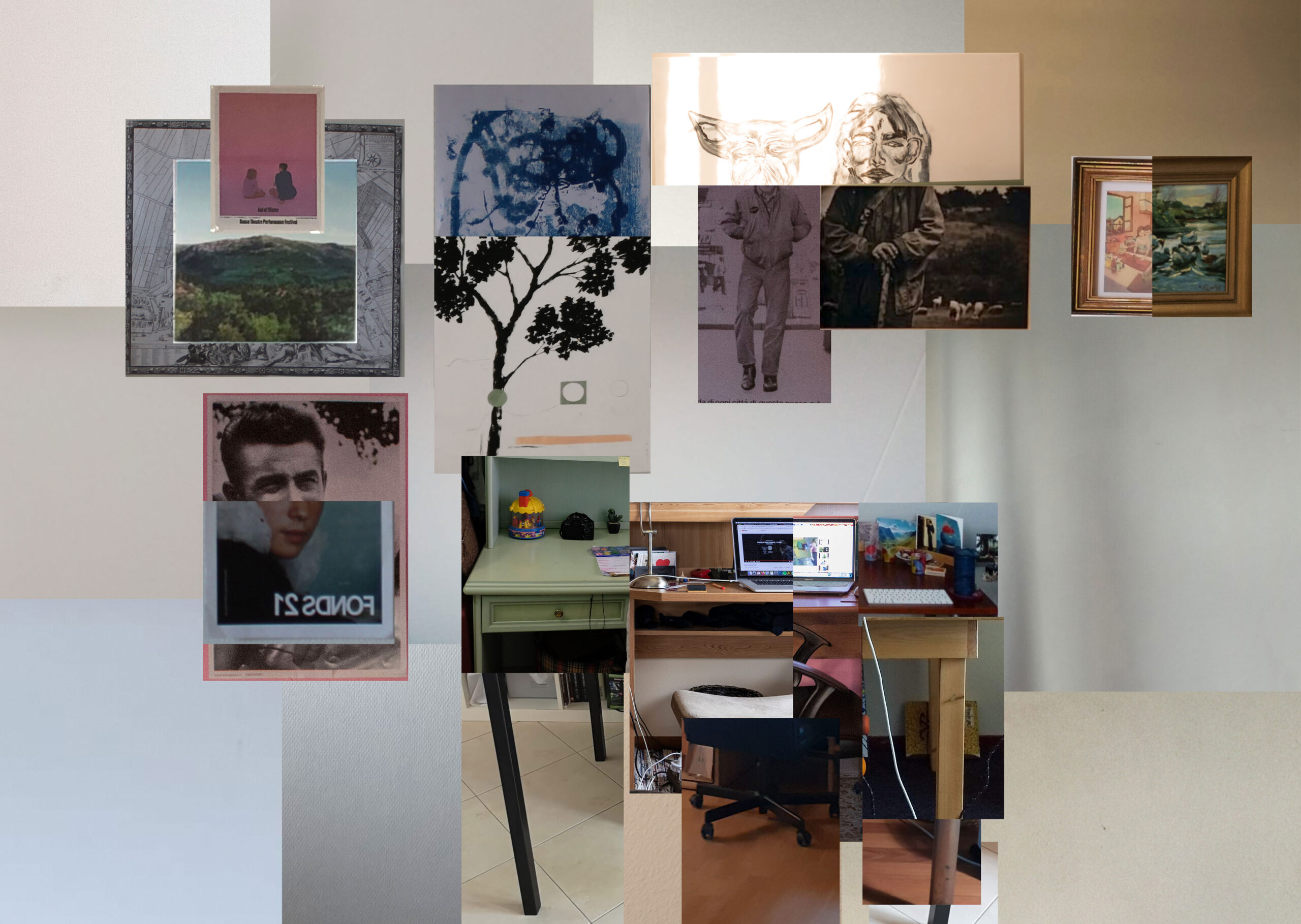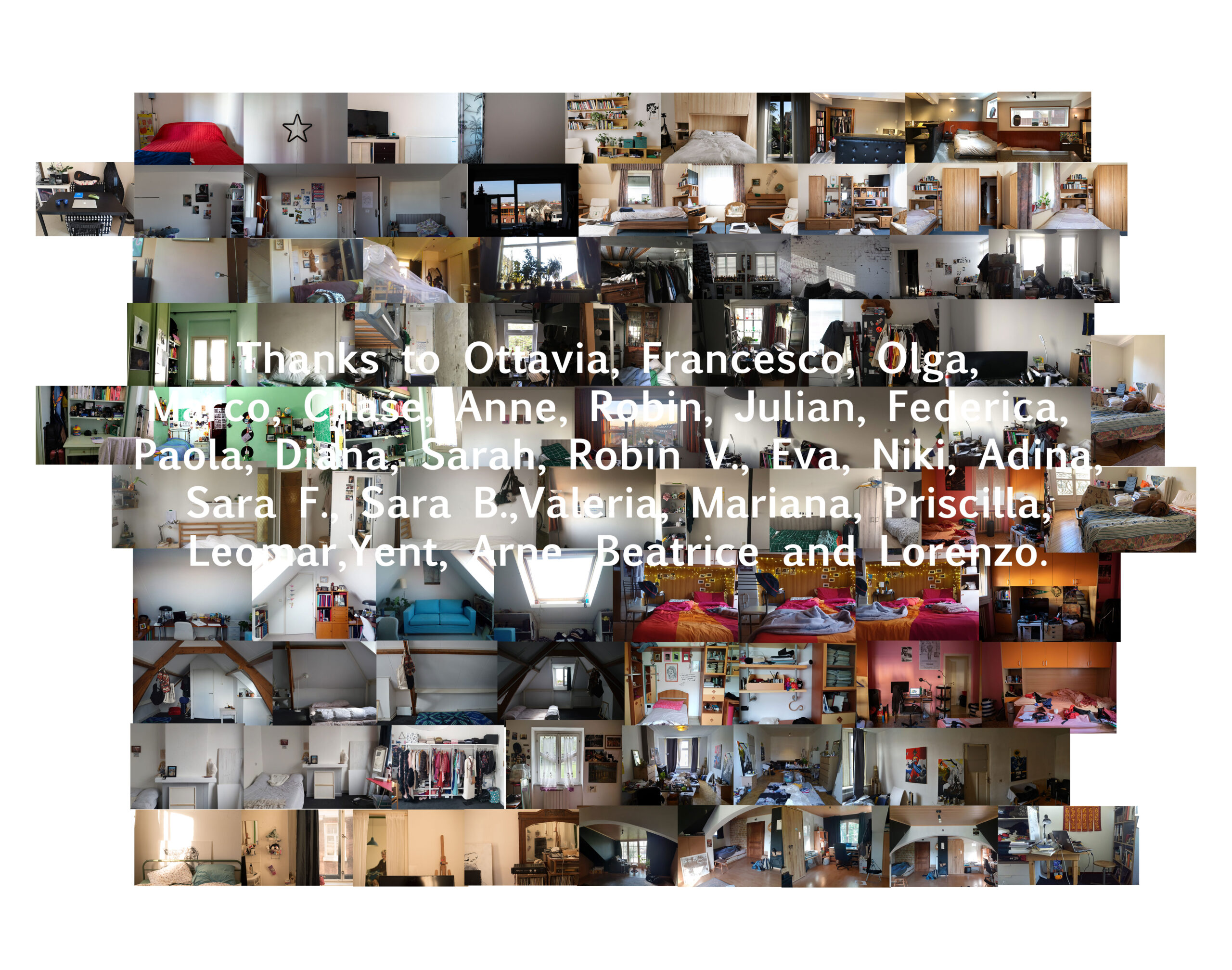 I asked my friends to send me pictures of their bedroom, so I am able to enter virtually into their life and to create a new place made of little pieces of each persons room. Without their contribution this space may have been empty and white. This project is a way to create a sense of union starting with fragments, to build a place where we can all be together visually and virtually.